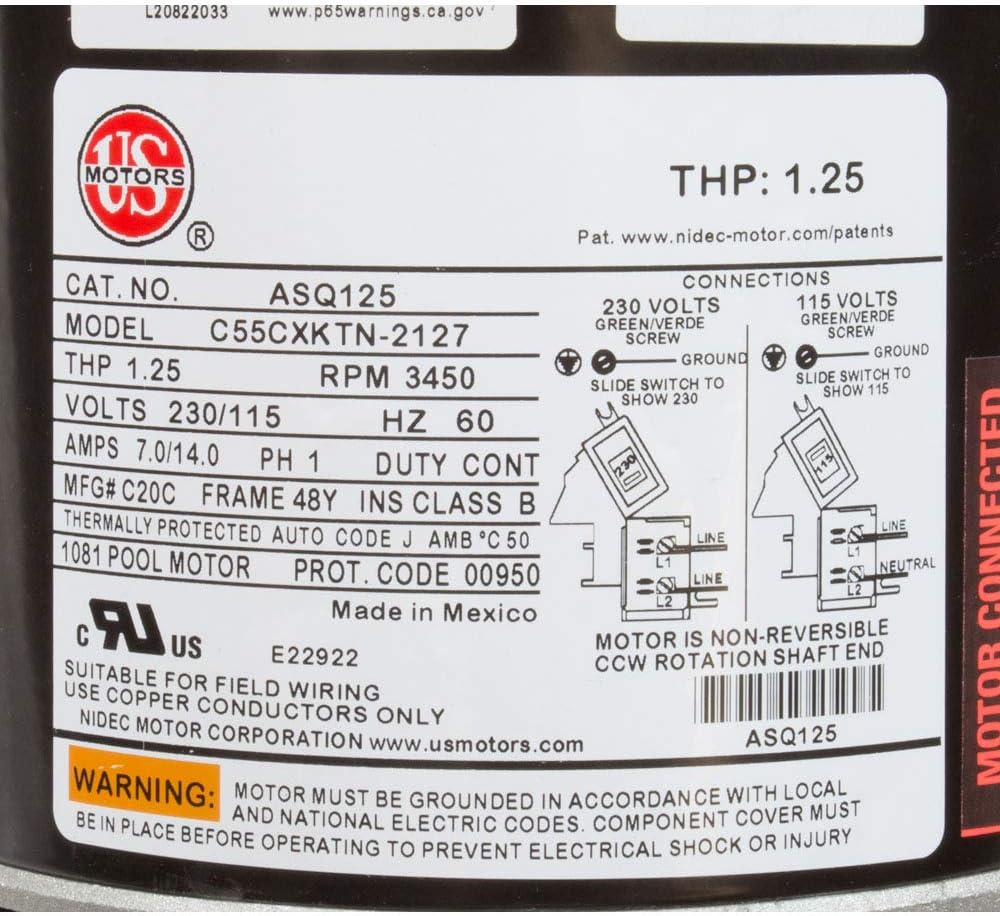 The AQUA-SHIELD ASQ125 is a high-performance, up-rated 1.25 THP motor designed for residential and commercial pool pumps. Its dual-voltage capability (115/230V) and Open Drip-Proof (ODP) design provide reliable operation and long-lasting performance. This motor is ideal for replacing existing pool pump motors with similar specifications.