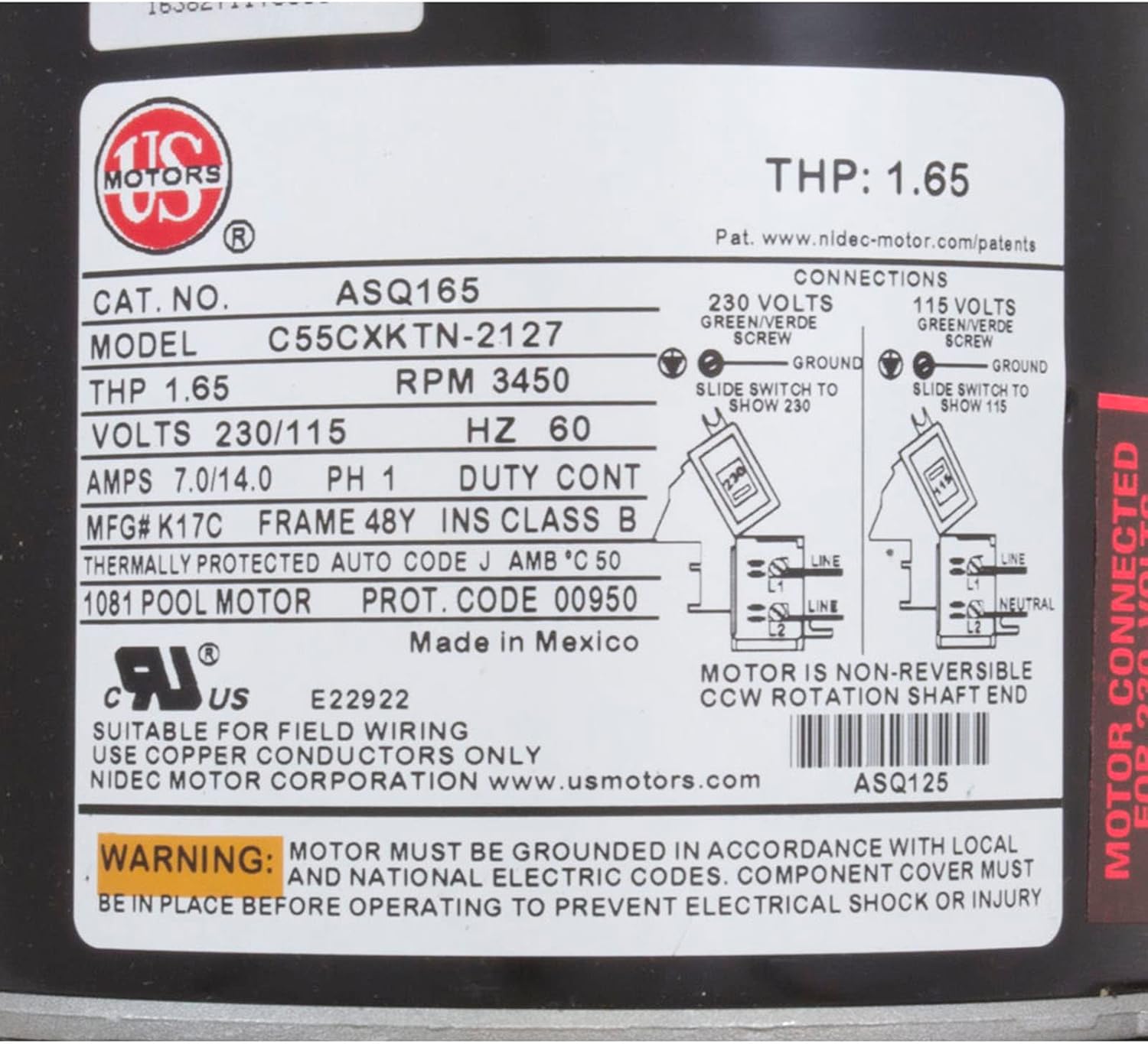 The AQUA-SHIELD ASQ165 is a high-performance, up-rated 1.65 THP motor designed for residential and commercial pool pumps. Its dual-voltage capability (115/230V) and Open Drip-Proof (ODP) design provide reliable operation and long-lasting performance. This motor is ideal for replacing existing pool pump motors with similar specifications.